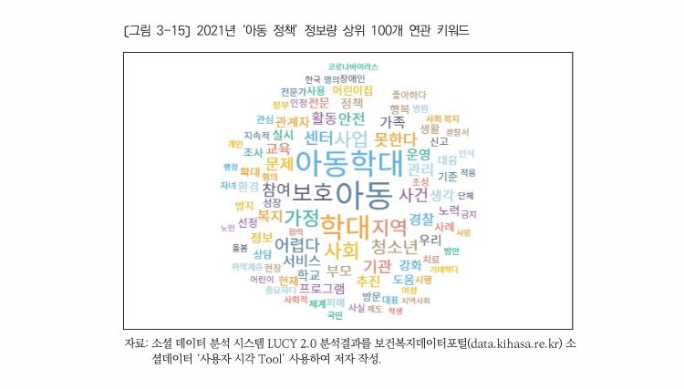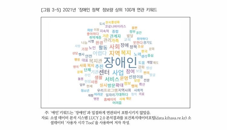 - 빅데이터, 소셜 빅데이터는 데이터 품질, 데이터의 대표성과 신뢰성, 개인정보침해 등에 대한 문제점을 지니고 있지만 점차 다양한 정책분야, 근거기반 정책연구에서 기존의 정형화된 조사데이터와 행정데이터를 보완하는 수단으로서 그 활용가치를 더해가고 있는 가운데 이번 연구에서는 소셜빅데이터 분석 플랫폼 중 하나인 LUCY2.0을 활용하여 장애인, 노인, 아동, 건강보장과 관련된 총 문서량, 월별 문서량 변화, 부정적 및 긍정적 키워드, 해시캐그 검색결과 등을 제시하였음.